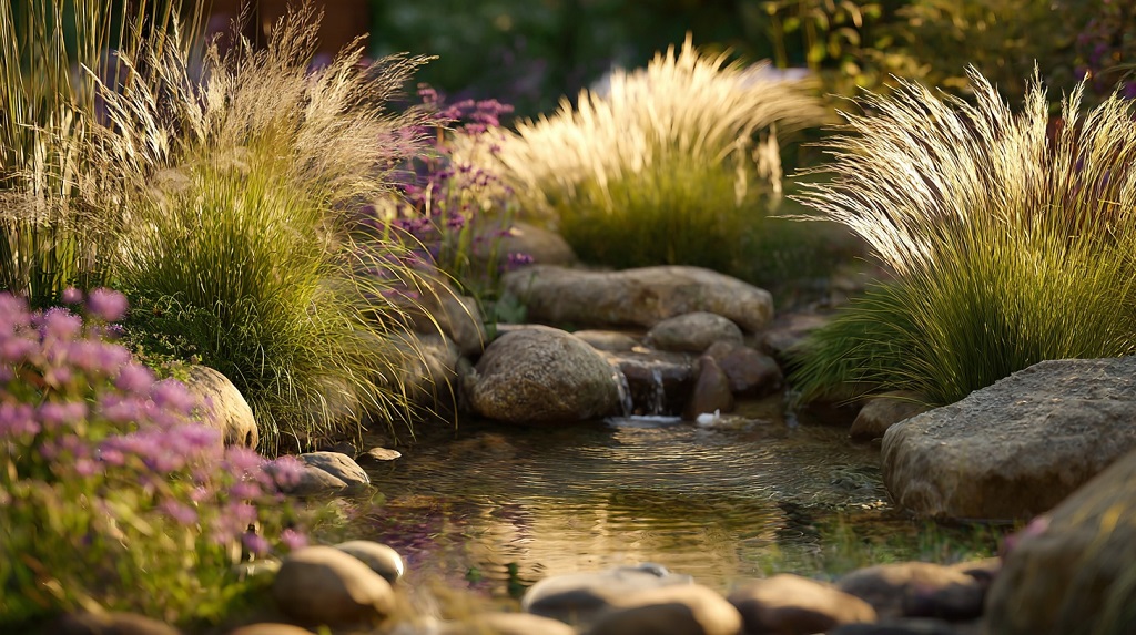 Fontanska trava ili japanska šumska trava posebno dobro funkcionišu u ovim postavkama, stvarajući efekat koji podseća na prirodne vodene ekosisteme.