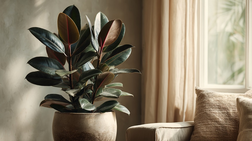 Fikus elastika, poznat i kao gumeno drvo, ima krupne, sjajne listove koji mogu biti zeleni, tamnobordo ili šareni.